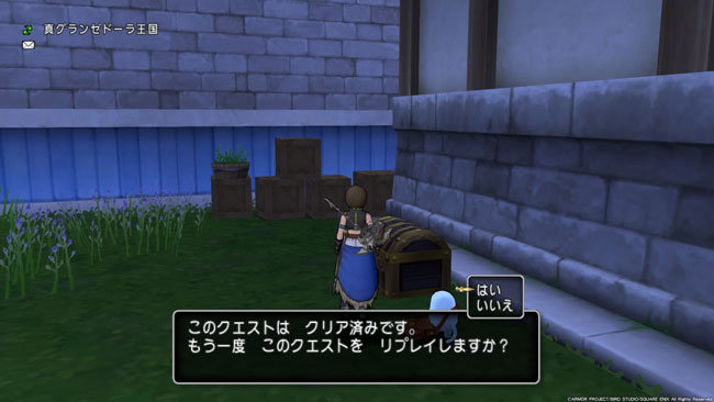 グランゼドーラ王国のグランマーズの館へ通じる宝箱を調べると、リプレイするか否かを聞かれるので「はい」を選択。