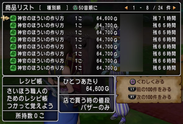 探してみたところ、「神官のほういの作り方」のレシピはあくま神官が持っているご様子。