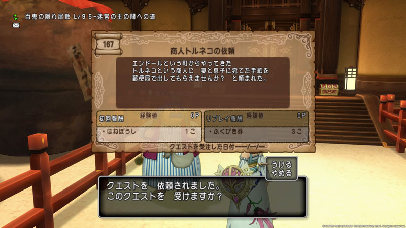 とはいえ、サブのこの子がトルネコさんに遭遇するのは初めてだったようで、リプレイじゃない形でクエストが発生したためとりあえず受けてみることに。